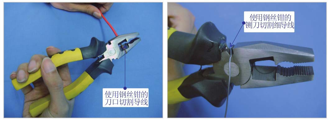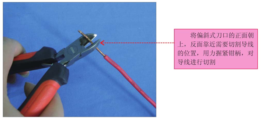 在使用斜口钳时,应将偏斜式的刀口正面朝上,背面靠近需要切割导线的位置,这样可以准确切割到位,防止切割位置出现偏差,如图4-4所示。