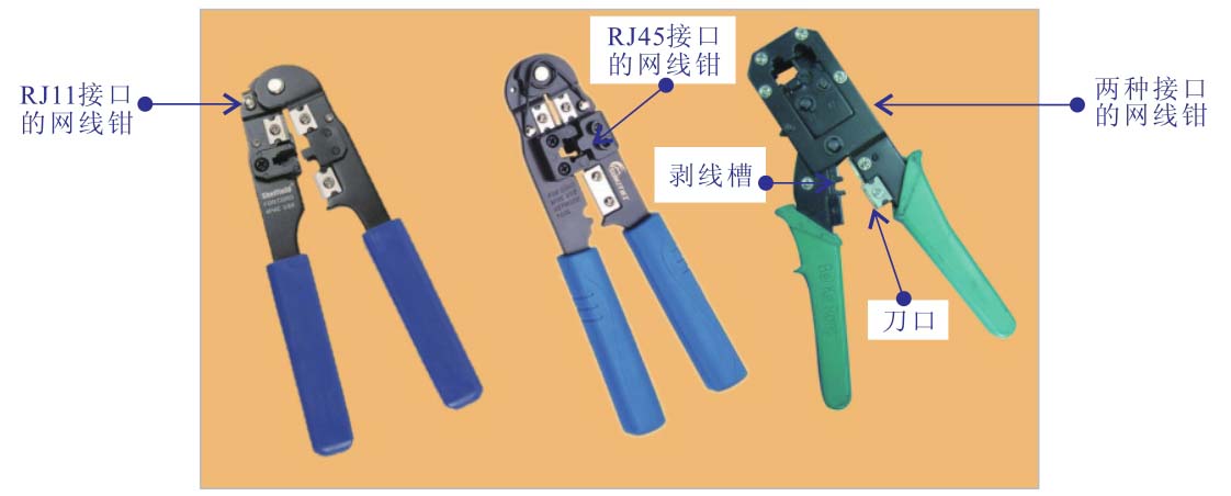 网线钳专用于网线水晶头的加工与电话线水晶头的加工,在网线钳的钳头部分有水晶头加工口,可以根据水晶头的型号选择网线钳,如图4-11所示。