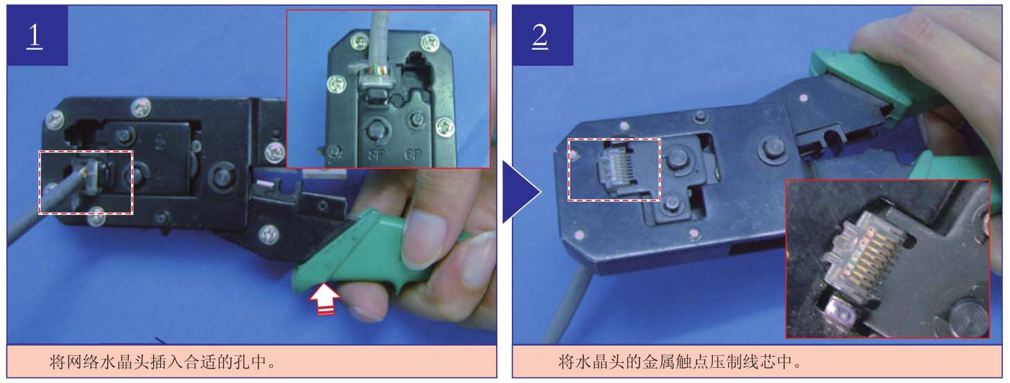 使用网线钳时,应先使用钳柄处的刀口对网线的绝缘层进行剥除,将网线按顺序插入水晶头中,然后将其放置于网线钳对应的水晶头接口中,用力向下按压网线钳钳柄,此时钳头上的动片向上推动,即可将水晶头中的金属导体嵌入网线中,如图4-12所示。