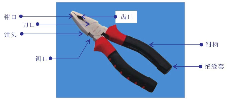钢丝钳又叫老虎钳,主要用于线缆的剪切、绝缘层的剥削、线芯的弯折、螺母的松动和紧固等。钢丝钳的钳头又可以分为钳口、齿口、刀口和铡口,在钳柄处有绝缘套,如图4-1所示。