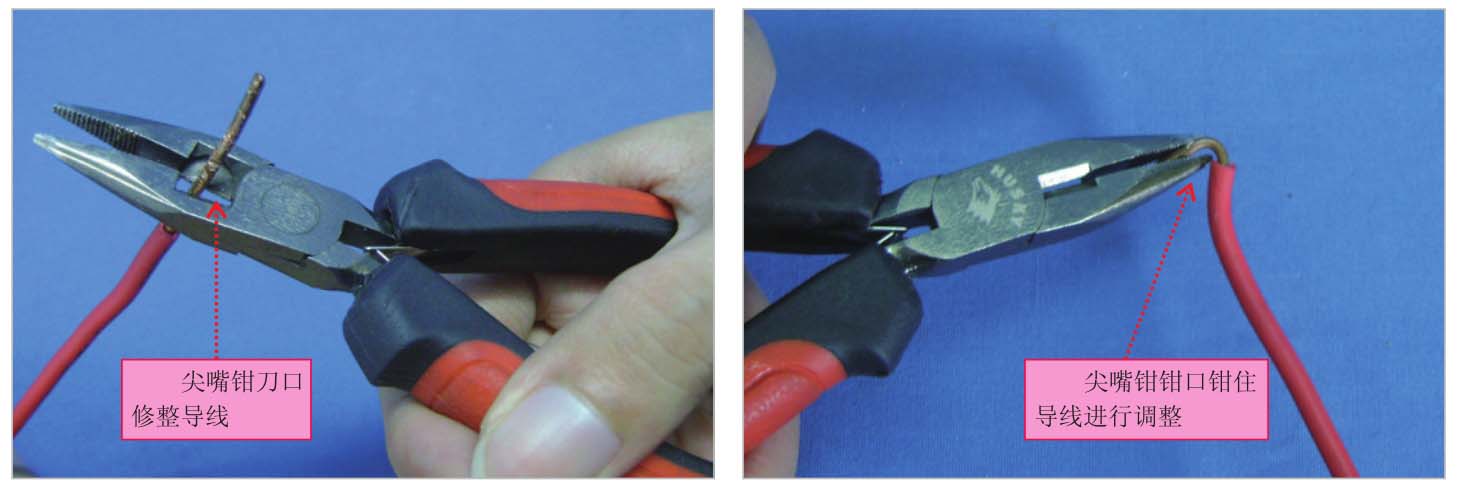 使用尖嘴钳时,用右手握住钳柄,不可以将钳头对向自己。可以用钳头上的刀口修整导线,再使用钳口夹住导线的接线端子,并对其进行修整固定,如图4-6所示。