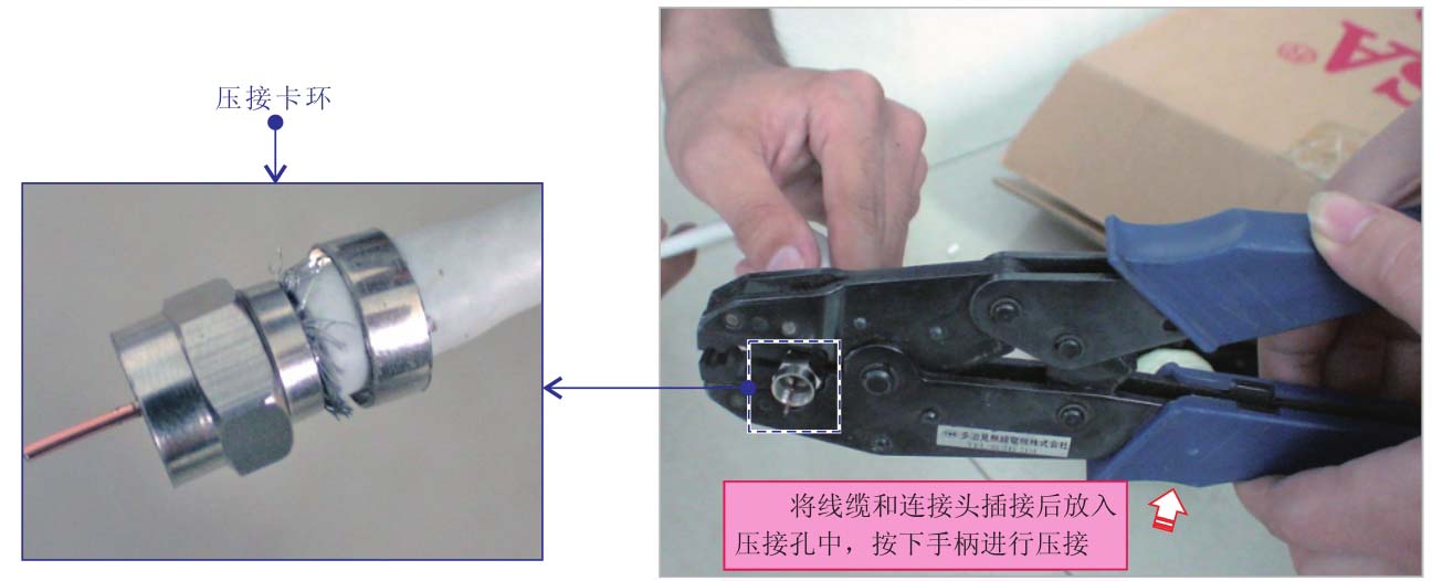 在使用压线钳时,一般使用右手握住压线钳手柄,将需要连接的线缆和连接头插接后,放入压线钳合适的卡口中,向下按压即可,如图4-10所示。