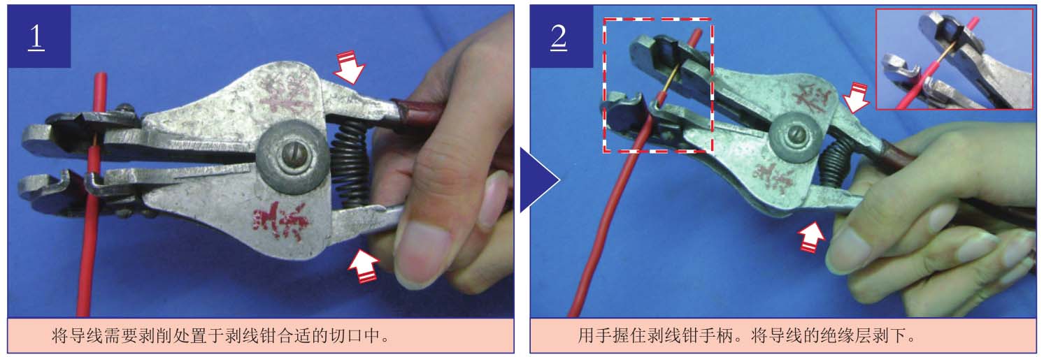 在使用剥线钳进行剥线时,一般会根据导线选择合适的尺寸的切口,将导线放入该切口中,按下剥线钳的钳柄,即可将绝缘层割断,再次紧按手柄时,钳口分开加大,切口端将绝缘层与导线芯分离,如图4-8所示。