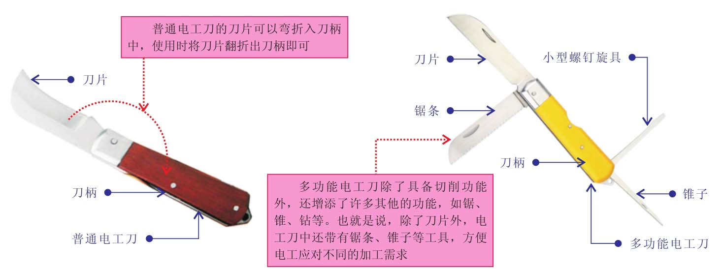 在电工操作中,电工刀是用于剥削导线和切割物体的工具。电工刀是由刀柄与刀片两部分组成的。如图4-16所示,常见的电工刀主要有普通电工刀和多功能电工刀。