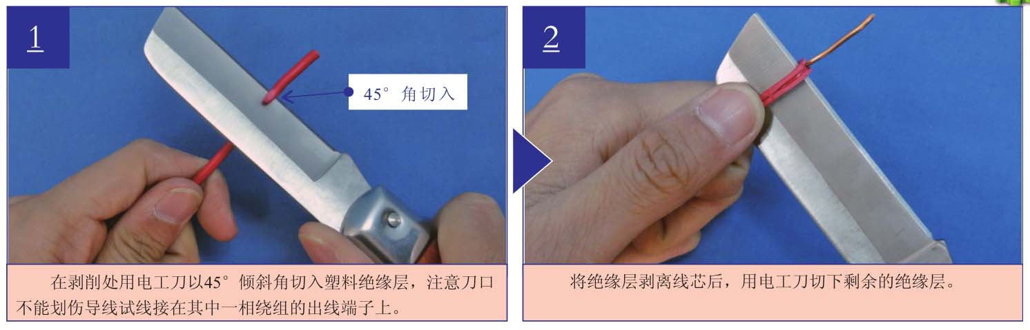 使用电工刀剥削线缆的绝缘层时,应一只手握住电工刀的刀柄,将刀口朝外,使刀刃与线缆绝缘层成45°角切入,切入绝缘层后,将刀刃略翘起一些(约25°),用力向线端推削,一定注意不要切削到线芯。图4-17为电工刀的使用规范。