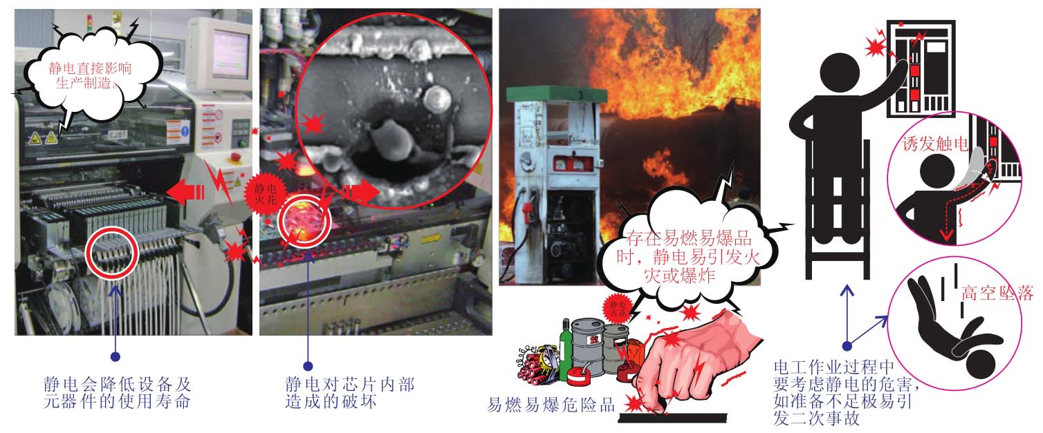 如图5-28所示,静电的危害主要有三方面:一方面是由于静电会直接影响生产,导致设备或产品故障,影响设备和产品的寿命等;第二方面是由于静电的电击现象导致操作失误而诱发的人身事故或设备故障;第三方面是由于静电而直接引发爆炸、火灾等事故。