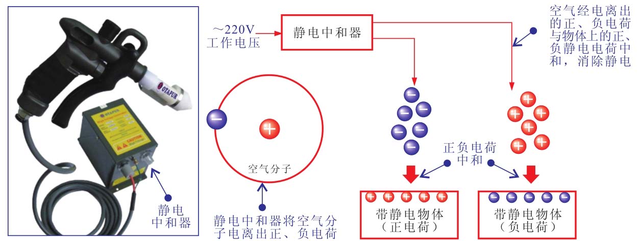 如图5-32所示,静电中和是进行静电防范的主要措施。它是指借助静电中和器将空气分子电离出与带电物体静电电荷极性相反的电荷,并与带电物体的静电电荷相互抵消,从而达到消除静电的目的。