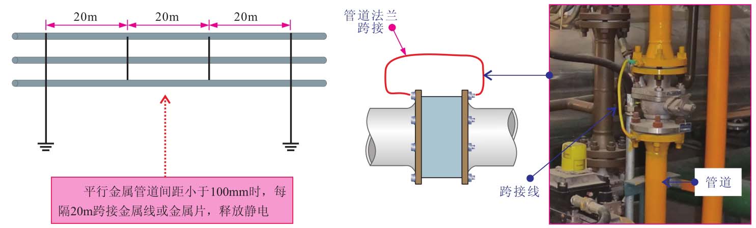 如图5-31所示,搭接和跨接是指将距离较近的(小于100mm)两个以上独立的金属导体,如金属管道之间、管道与容器之间进行电气上的连接,使其相互间基本处于相同的电位,防止静电积累。