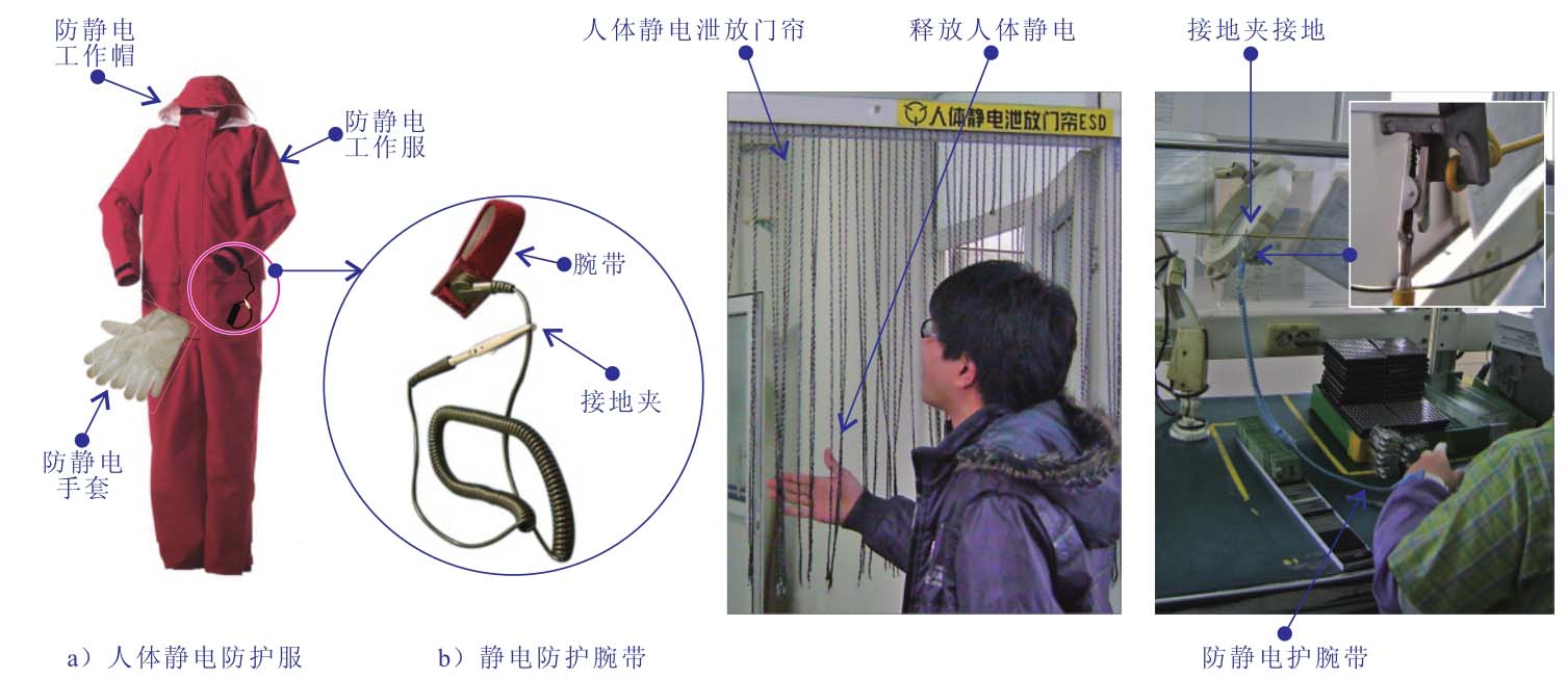 人体接地就是将人体与大地“连接”,将人体所携带的静电通过导体释放到大地中。图5-29所示为常采用的人体接地方式。