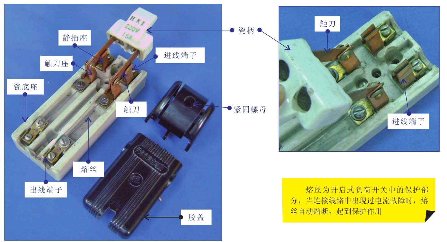 开启式负荷开关俗称胶盖闸刀,该类开关通常应用在低压电气照明电路、电热线路、建筑工地供电、农用机械供电以及分支电路的配电开关等。其主要是在带负荷状态下接通或切断电源电路。图2-1为开启式负荷开关的结构外形。