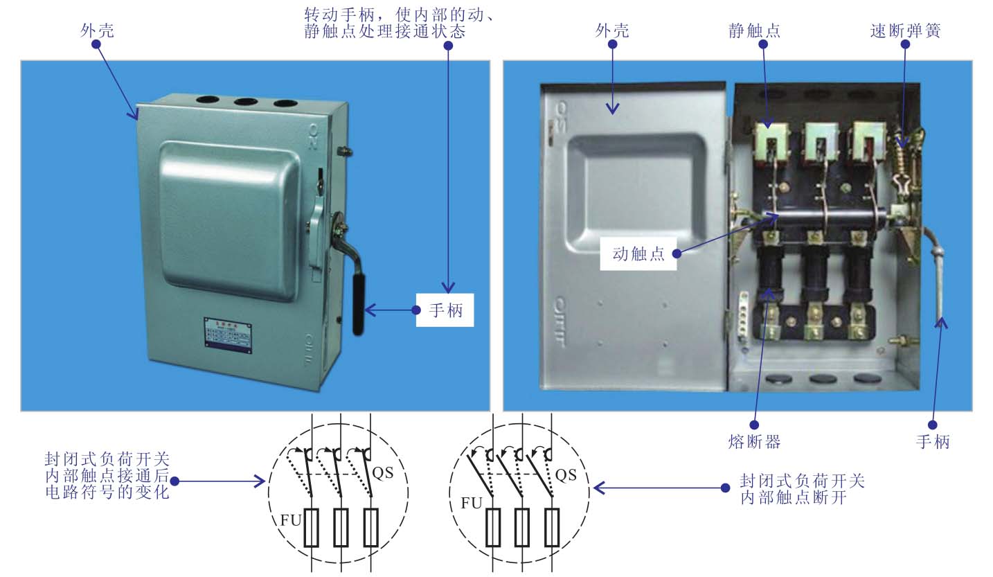 封闭式负荷开关内部使用的速断弹簧,保证了外壳在打开的状态下,不能进行合闸,提高了封闭式负荷开关的安全防护能力,当手柄转至上方时,封闭式负荷开关的动、静触点处于接通状态;当封闭式负荷开关的手柄转至下方时,其动静触点处理断开的状态,此时也断开了电路。