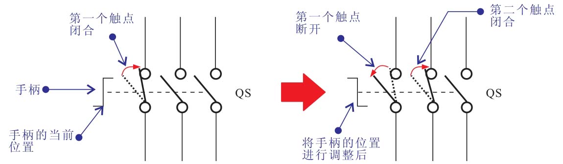 当组合开关的手柄转至不同的位置时,实现的功能也不相同,当手柄转至不同的档位时,与其相关的两个触点闭合,其他触点断开。