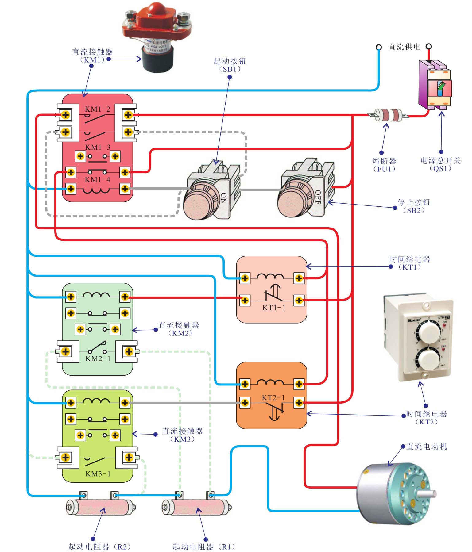 在实际应用中,直流接触器用于远距离接通与分断直流供电或控制电路。如直流电动机起停控制,图2-9为直流接触器在典型直流电动机的起停控制电路中的应用。
