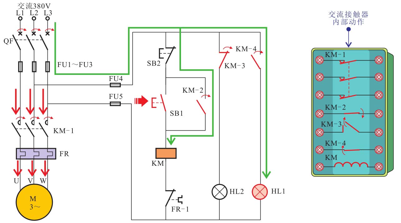 同时,常开辅助触点KM-2闭合实现自锁功能;常闭辅助触点KM-3断开,切断停机指示灯HL2的供电电源,HL2随即熄灭;常开辅助触点KM-4闭合,运行指示灯HL1点亮,指示水泵电动机处于工作状态。