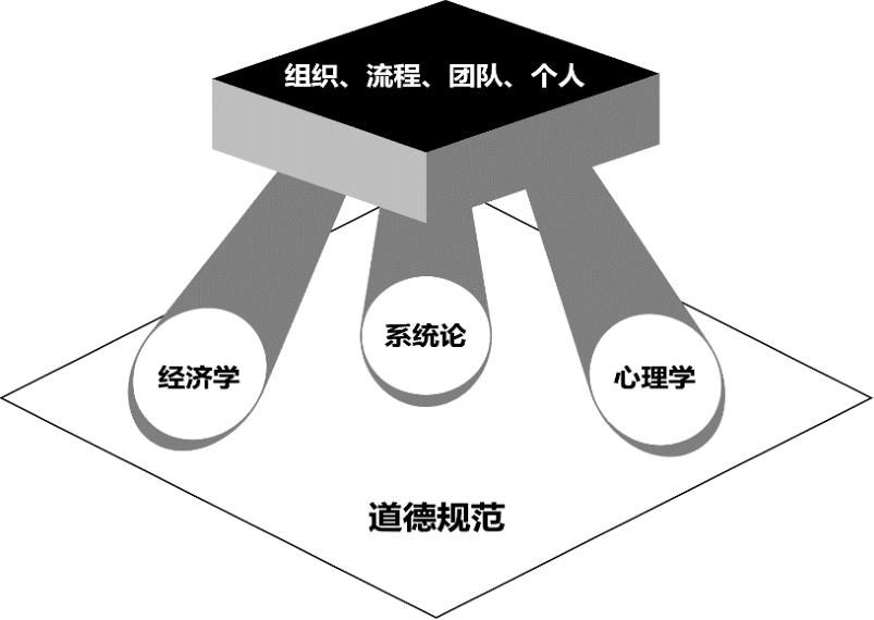这套理论包括经济学、系统论和心理学。这三种理论各自有独特而完善的理论体系且又彼此互补,共同形成一个完整的理论架构。可将这三种理论形象地比喻为一把“三脚凳”,这把凳子的三条“腿”为绩效改进在复杂多变的条件下的运作提供了稳定性(见图2-2)。同时,这把凳子必须置于一块道德规范的“地毯”上,这条地毯发挥过滤器的作用。三大基础理论是整个绩效改进的核心理论,而道德规范则起着非常重要的调控作用。