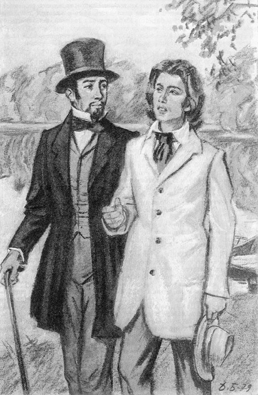 “我真想再洗一回澡,”舒宾说道,“可是我怕来不及了。瞧这河水:它像在朝我们招手呢。要是古希腊人,一定会以为那里面有个仙女吧。可是我们不是希腊人。啊,仙女!……我们不过是厚皮的粗野不文的人罢了。”