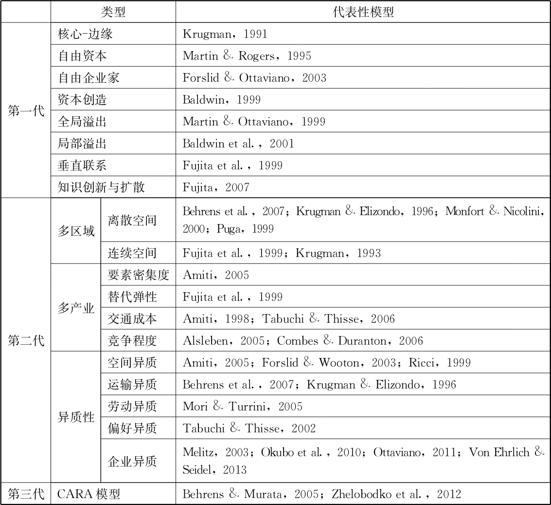 从第二自然的视角对产业布局进行的最系统的研究当属新经济地理。新经济地理自诞生以来,经历了三次革命、形成了三代模型,构建了较为完整的理论体系(见表2—1)。