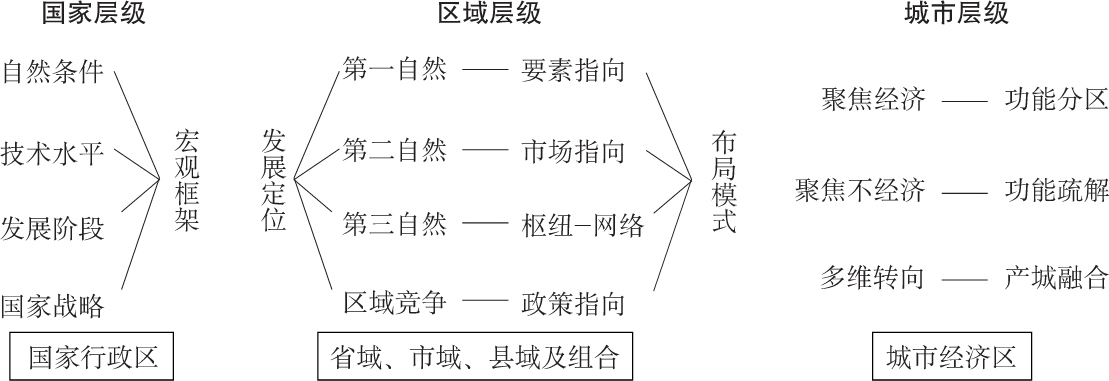 参考胡安俊、孙久文(2018)的研究,从产业布局的规划需求出发,将产业布局分为国家、区域和城市三个层级,系统归纳产业布局的主导因素与主要模式(见图2—1)。从空间范围看,国家层级对应国家的行政区范围;区域层级对应区域规划的范围,包括省域、市域、县域三种行政区单元及其不同的组合;城市层级是城市(城乡)规划的范围,与城市经济区相对应,主要包括建成区,也包括与建成区具有紧密联系的乡村空间。国家层级的产业布局是从整个国家的大局出发,统筹考虑自然条件、技术水平、发展阶段和国家战略,谋划产业布局的总体框架。区域层级的产业布局是在区域发展定位的基础上,研究第一自然、第二自然、第三自然和区域政策作用下,产业布局的要素指向、市场指向、枢纽—网络和政策指向等模式。区域层级的产业布局,一方面,要充分发挥区域比较优势与聚集经济,重视人力资本与信息网络的作用,积极建设枢纽—网络空间;另一方面,也要积极发挥区域政策优势,协调区际关系,优化产业空间布局。城市层级的产业布局则从创造有序的城市生产生活空间出发,研究聚集经济与功能分区、聚集不经济与功能疏解、多维转向与产城融合等规律。从理论和实践两个方面对既有研究进行了拓展:一是系统总结产业布局的原理与范式,搭建产业布局学的理论体系;二是从产业布局的实践需求出发,归纳影响产业布局的主导要素和主要模式,为各层级的布局实践提供参考。