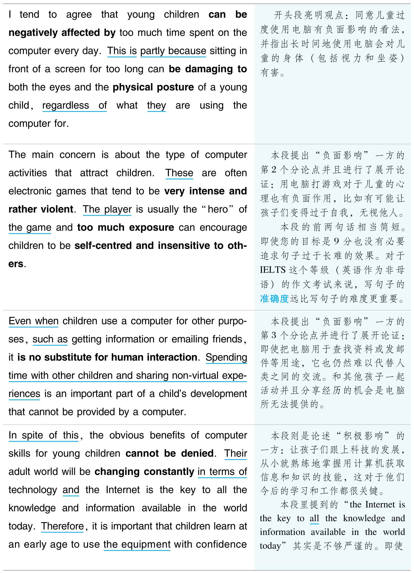 同时,Pat要提醒冲7的同学注意的是:在IELTS写作评分标准细则里对于7分作文在行文衔接方面的准确要求是 uses a range of cohesive devices 。因此,对于上述的任何一种明连接和暗承接方式都不应过度地沉迷。试想,如果一篇作文完全排斥连接词,而是变成所有句子之间全都是用this,they,their,the+名词,such+名词等来指代的暗承接,那么文章也就走入了另一个极端,变成了另一种单调。高分范文在行文衔接方面的真正共同点是 通过对于“明连接”和“暗承接”的综合、准确的使用所获得的丰富、多样的上下文衔接效果 。从本书中的各高分范文实例里您将能够最清晰地体会到这一点。