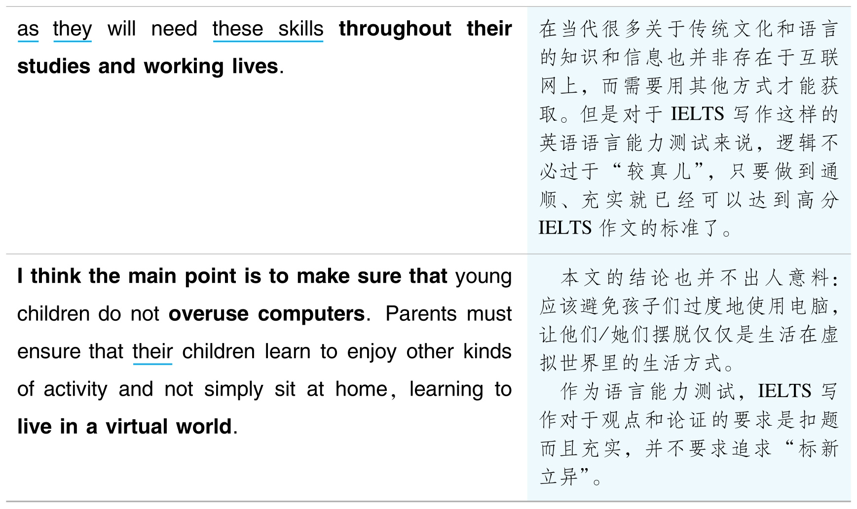 说明 :在后面一句话里用their来指代前一句话里面的young children所拥有的,从而做到了“不用连接词,却胜似连接词”的自然承接效果。