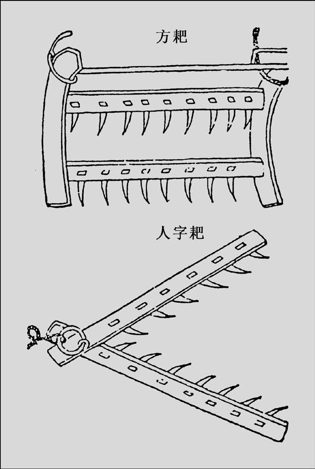 (lòu)楱(còu): 这是牲畜拉的铁齿耙,不是手持的钉耙。《东鲁王氏农书》(简称《王氏农书》)认为就是人字耙,但也不排斥方耙,今采其图作参考(见图一)。它用于耕翻后的耙细土块,平整土地,灭茬除草。也用于苗期的中耕松土。都是有利于保墒抗旱的。