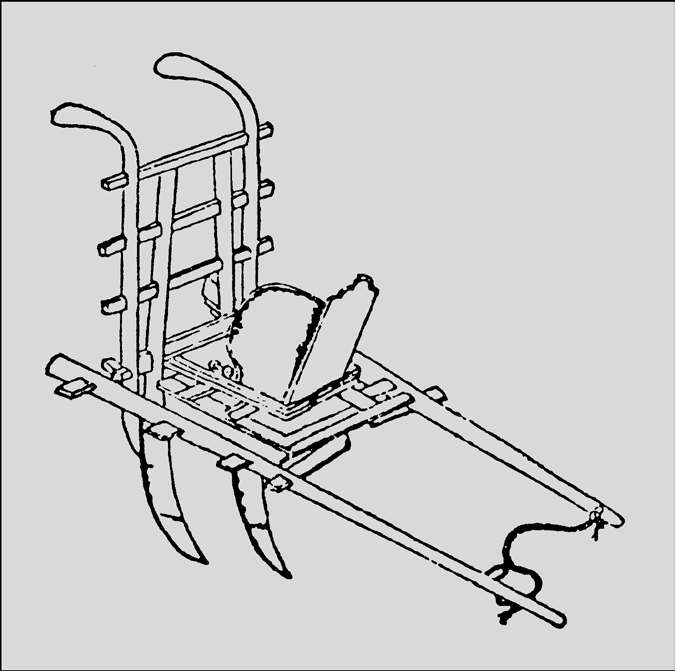 〔8〕三脚耧: 耧车,也叫耧犁,现在也叫耩子,有一脚、两脚、三脚等分,北方通用的条播器。由耧架、耧斗、耧脚、耧镵等构成,由牲畜牵挽,以耧镵开播种沟,种子从耧斗中通过中空的耧脚下到沟里,开沟下种同时完成。兹采《王氏农书》的两脚耧供参考(见图四)。