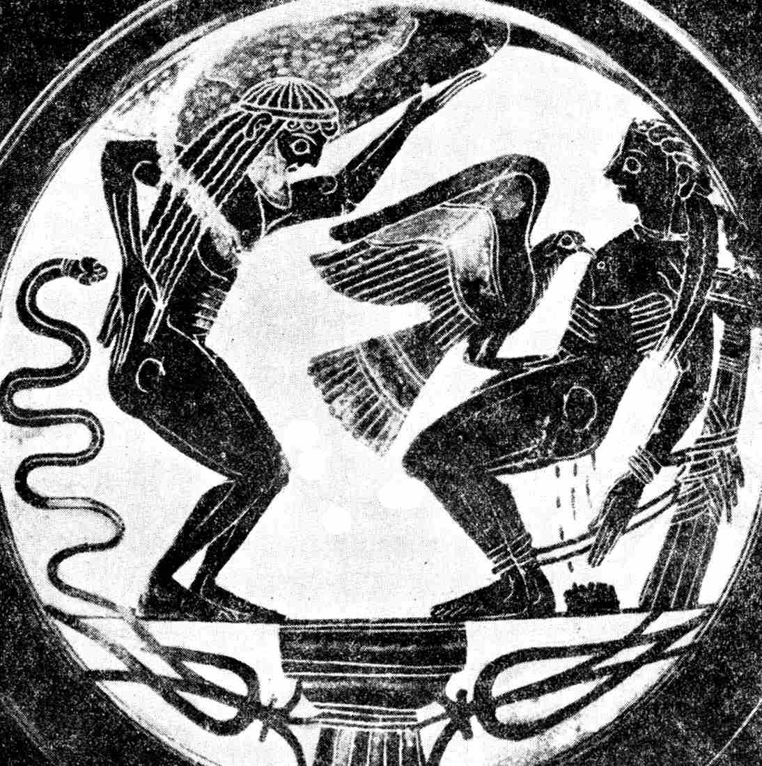 公元前六世纪瓶画。普罗米修斯被绑在一根石柱上。宙斯的鹰正在啄食他的肝,从肝上淌下一滴滴的血来。阿特拉斯站在普罗米修斯前面,也正忍受着宙斯的惩罚,用肩膀扛着天,显得很吃力的样子。他们脚下的地面,由一根石柱支着,表示这一幕故事是发生在一个远离人烟的遥远的地方。