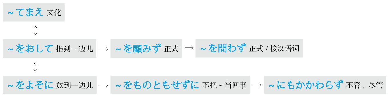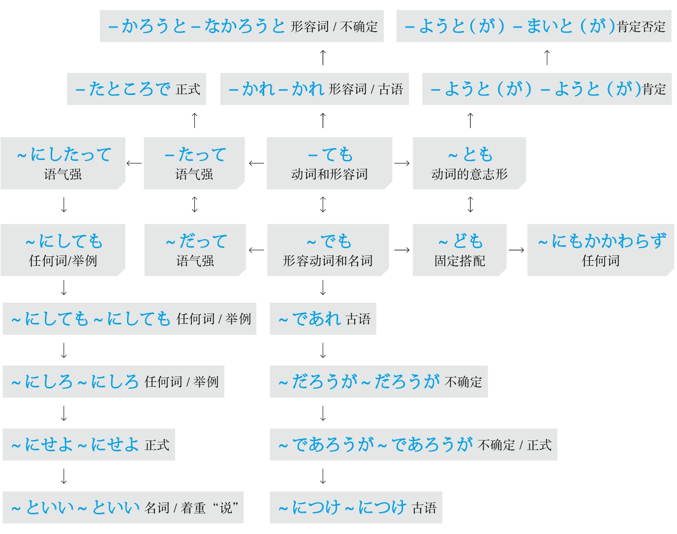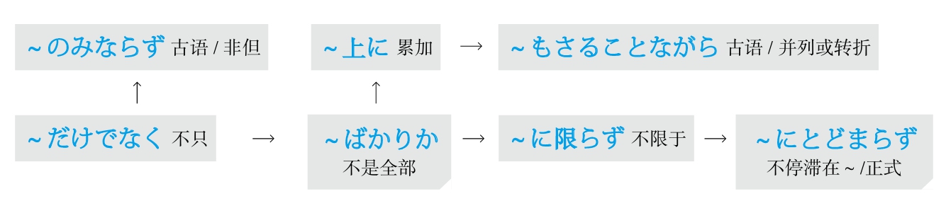 注意: 1.后面的句子要用表示“也”的「も」、「まで」、「までも」中的任何一个,这三个词从左到右语气递增。2.前后必须是同类事项
