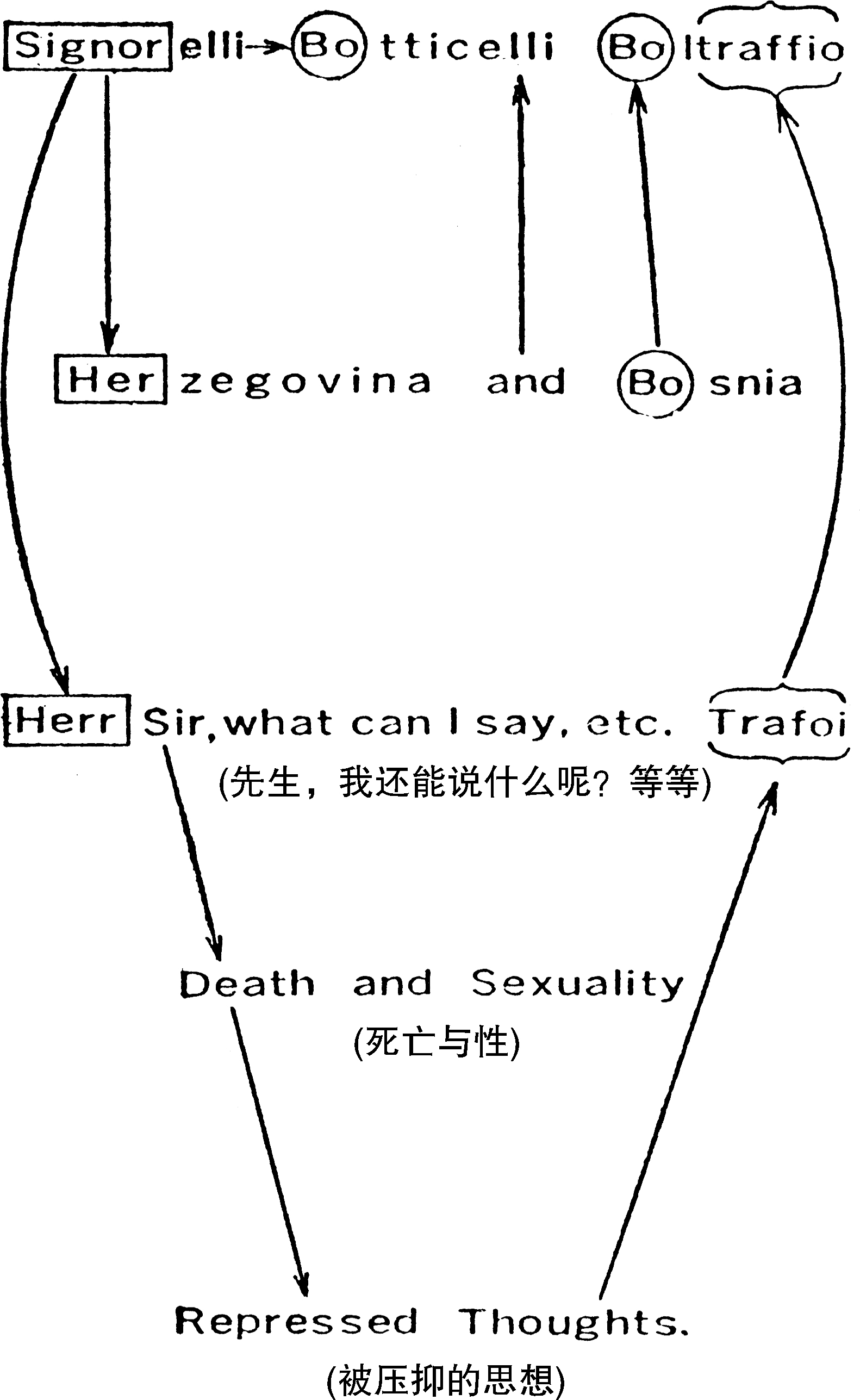 (Sir,Herr)的翻译而获得与被压抑的主题之间的种种关系,但是也经由此,而于再现的过程中消失掉。至于它的替代名字,其形成的过程,正表示是经过同样的关联——即Herzegovina和Bosnia——不管它们之间意义或音感上有什么差别,而生成的一种置换现象。所以说,在这个变迁过程中,所有的名字就像是字谜里头各句子中固定的字节一样,由于意识对这个过程的情报不明,于是Signorelli这个名字就变成了新出现的替代名字。乍看之下,似乎含有Signorelli这个名字的那个话题和紧接在此话题之前的被压抑主题之间,没有什么明显的关系存在。