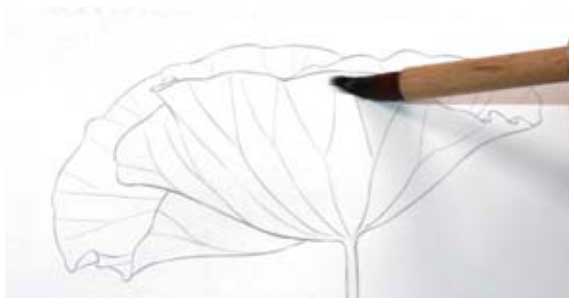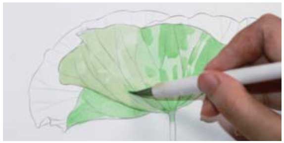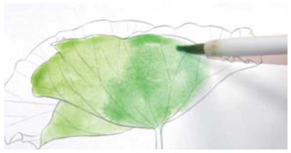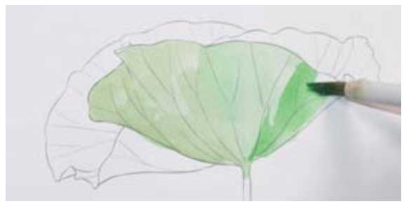 01 用树汁绿加少许土黄混合,绘制荷叶背面。