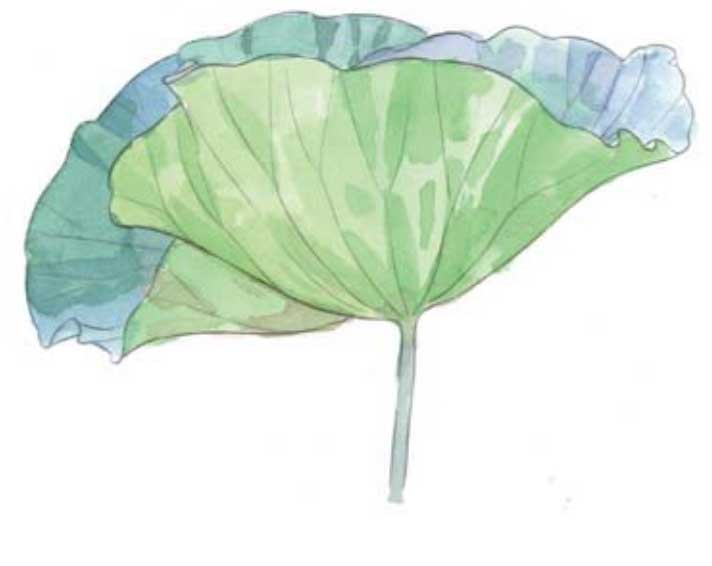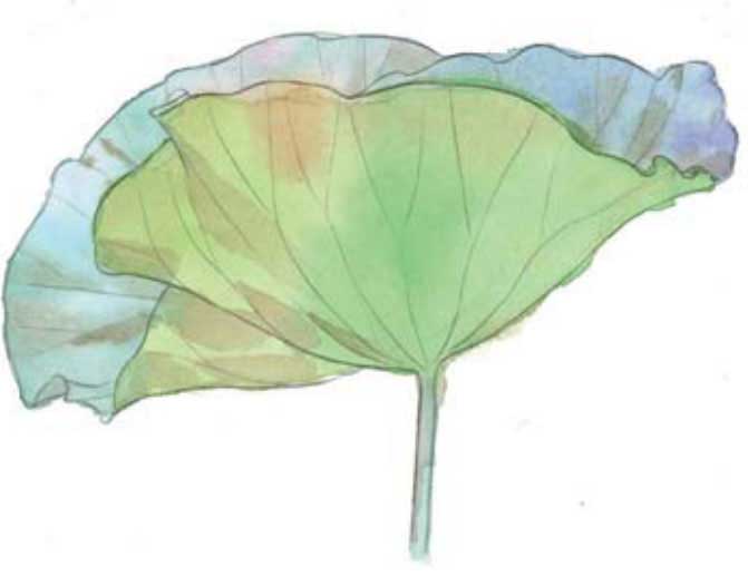 04 等荷叶背面的色块干了以后,用同样的湿画法画叶子正面和叶茎。先打湿色块,趁湿加入酞青天蓝、普蓝、永固蓝紫和玫红,半干时加入几笔褐色画出阴影。颜色干透以后在荷叶背面用赭石增加一些阴影。湿画法画出的色块会晕染得更加自然柔和。