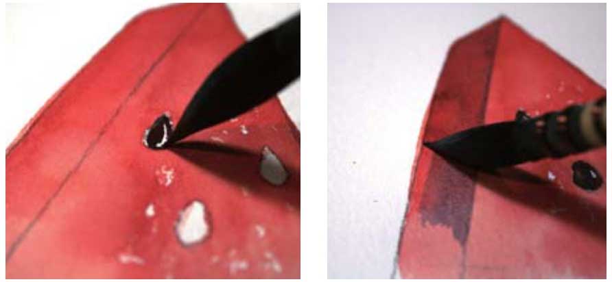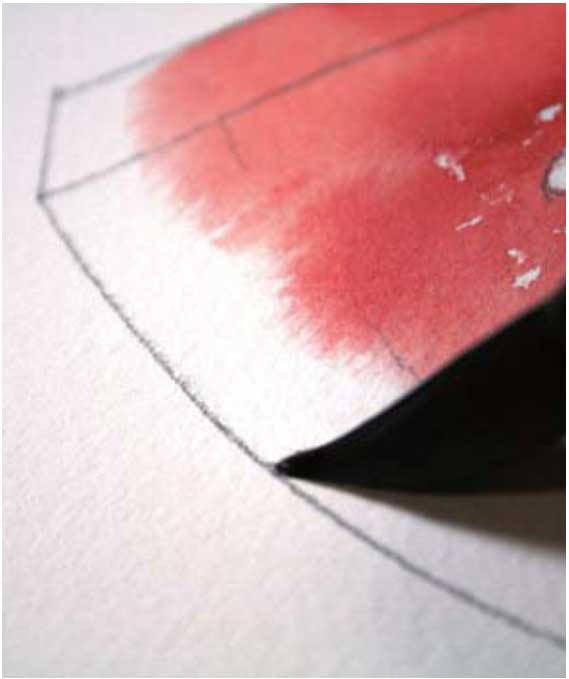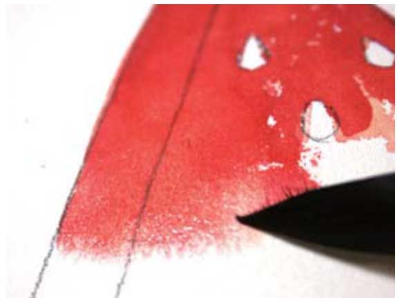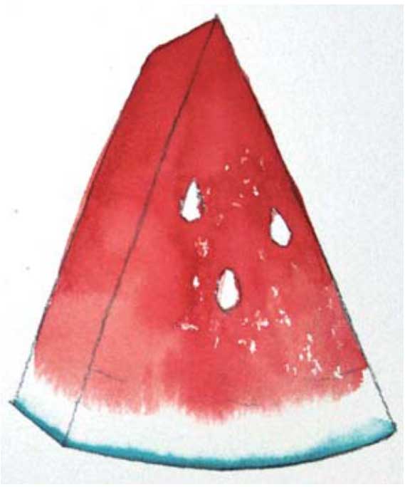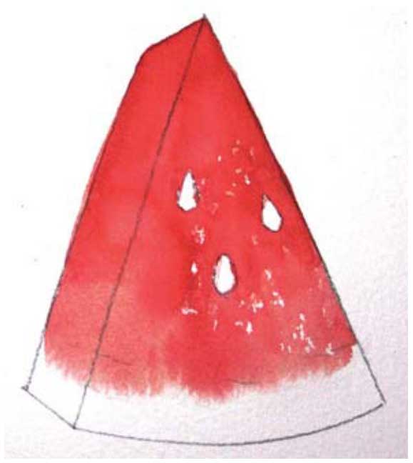 02 用朱红色画出瓜瓤部分,注意用笔腹作画,接着向下运笔,画至湿润的画纸处,让颜色自然晕染,表现瓜瓤的边缘。