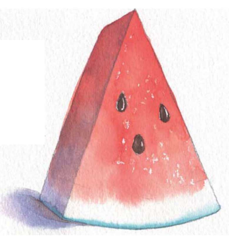 08 接着用永固蓝紫色画出瓜瓤的暗部,最后画出投影。干湿结合的画法使画面层次更加丰富。