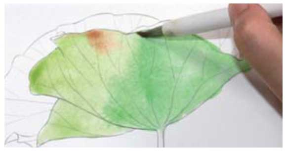 03 只要色块水分没干,就可以继续添加颜色。在叶边稍微地点入几笔赭石色,丰富色块颜色。