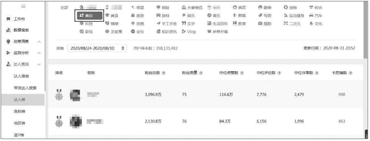 进入“达人榜”页面,单击“美妆”按钮,查看美妆类短视频达人榜单,如图2-12所示。