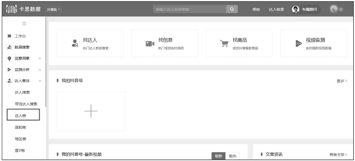 打开卡思数据网站,单击“抖音版”选项,进入卡思数据抖音版账号后台,在页面左侧单击“达人查找”下拉菜单中的“达人榜”按钮,如图2-11所示。