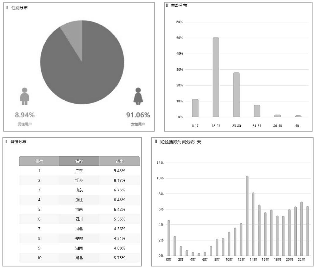 单击“粉丝画像”按钮,即可查看该达人的短视频账号的粉丝画像,如性别分布、年龄分布、省份分布、粉丝活跃时间分布等,如图2-14所示。