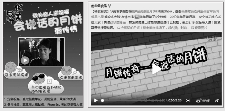 华美食品在临近中秋之际,在微信、微博和微视等新媒体平台上办了一场促销活动——华美“会说话的月饼”。其微视频以动画的形式,用诙谐幽默的手法,并借助网络热门元素描述月饼的前世今生。