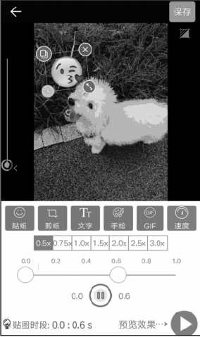 (3)手机软件制作GIF动图。在手机软件商店中搜索关键词“GIF”,可找到各种GIF制作软件,如图1-10所示。使用这些软件制作GIF动图非常方便,以“GIF动图制作”为例,它是一款利用图片、连拍快照、视频轻松制作GIF动图的手机应用软件。其原理是通过高速连拍图片来制作GIF动图,或从视频影像中截取片段制作GIF动图或视频短片。同时,还支持对动图和短片进行编辑,可添加文本、滤镜,调整播放速度、播放方向,完成后还能保存并直接分享到社交媒体中,如图1-11所示。