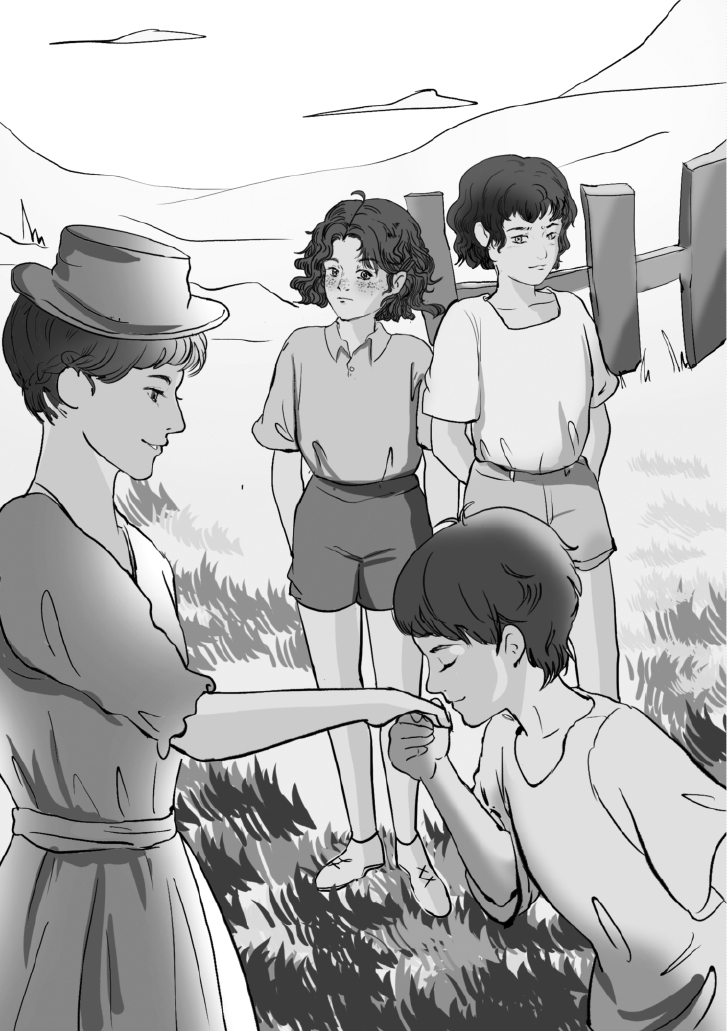 他向坎宁安夫人走去,握住了她伸过来的手。但是他并没有像普通人之间的握手那样只是摇晃一下,而是优雅地弯下身,用唇轻吻了她的手背。坎宁安夫人被逗笑了,四个孩子也饶有兴趣地看着这一幕。