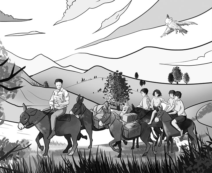 一行人很快又重新骑上了驴子,沿着山坡继续稳步地前行,尽情享受着山风与阳光。每转过一个弯,眼前都会出现不同的风景。不断有高耸的山峰在远处露出它们的头颅,也不断有新的天际线显现出来。在相当长的一段时间里,孩子们全都一言不发,只是沉醉在四周的美景、阳光与山风之中。