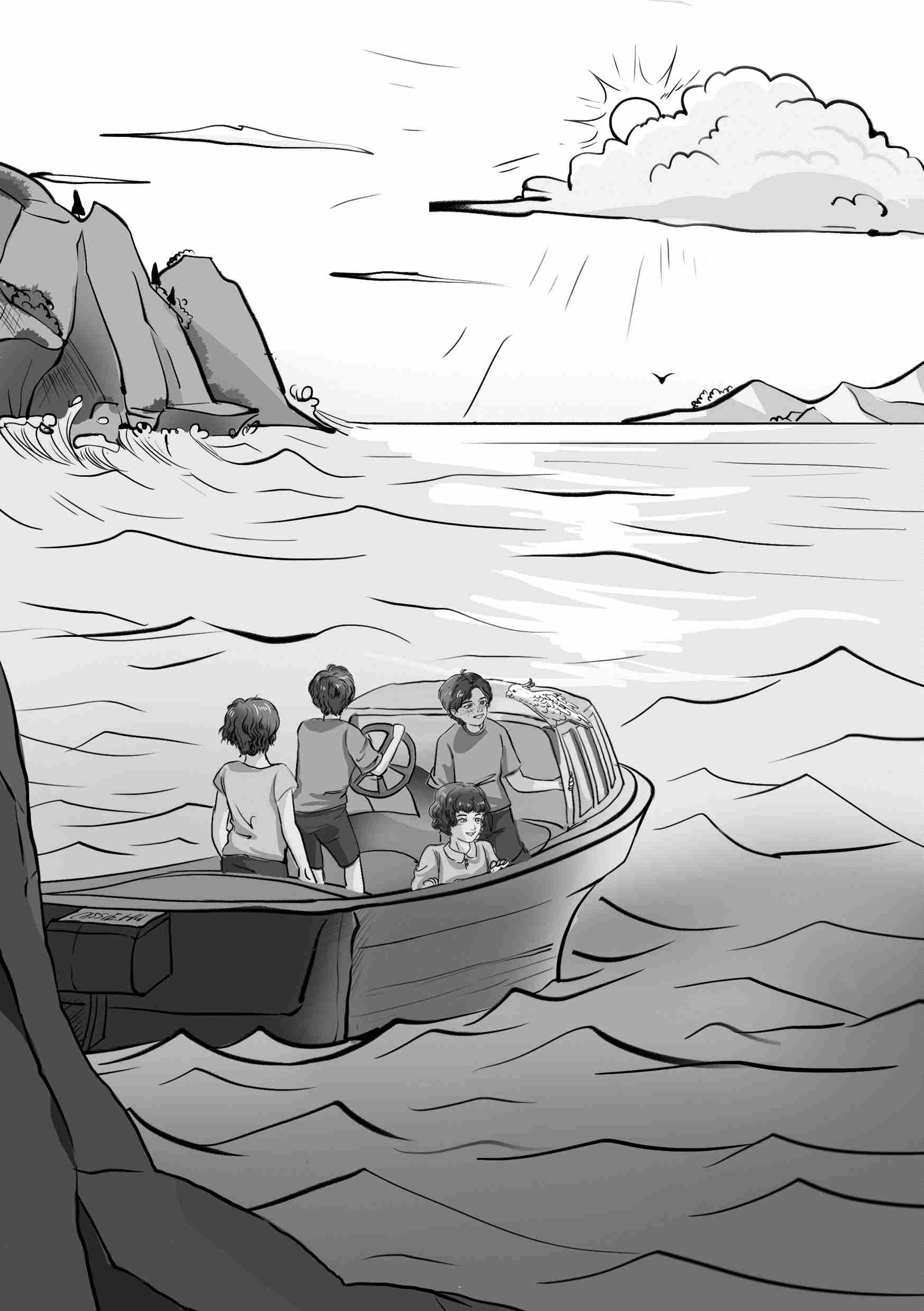 菲利普骄傲地接过了船舵。他们在蓝色的水面上疾驶而过,船的引擎发出平稳的呜呜声。