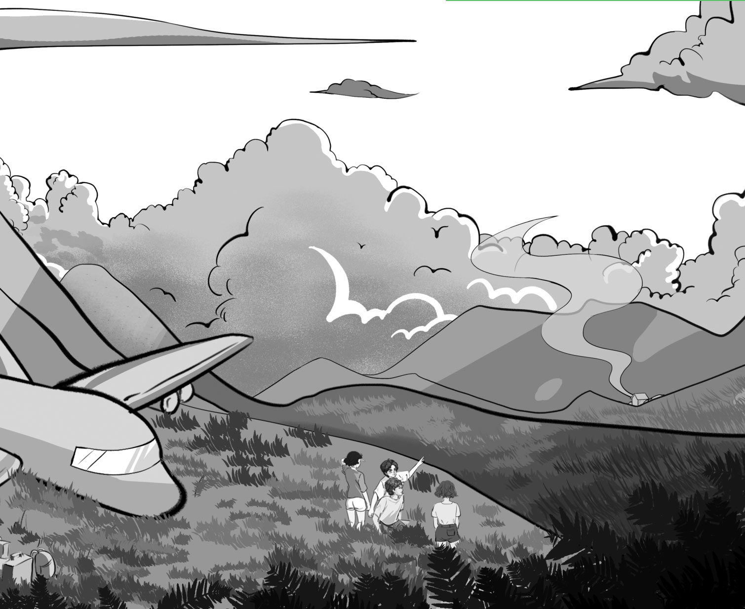 “我们接着往前走吧,”黛娜想了想,说,“一直走到前边的小山坡那里。如果我们可以继续往山上爬,我们就能看到降落在山谷的飞机的情况,这还可以给我们一些方向感。所以,我们还是待在那片树林里吧。”