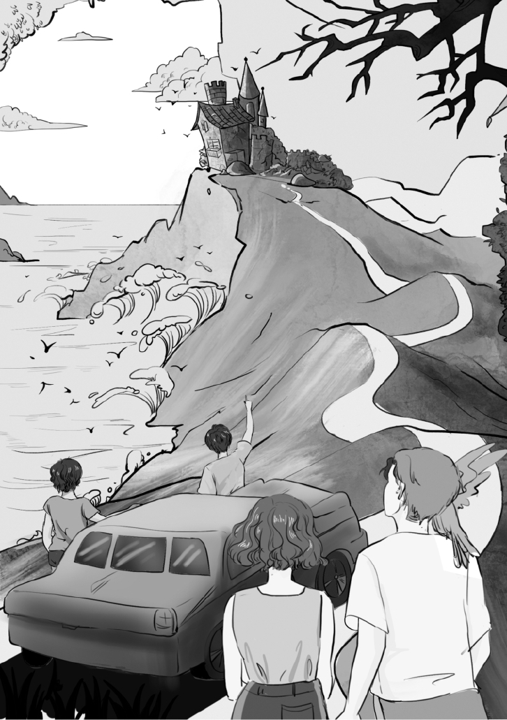 突然,耸立在悬崖半山腰的陡峭山庄出现在众人眼前,它的下面就是咆哮的大海。