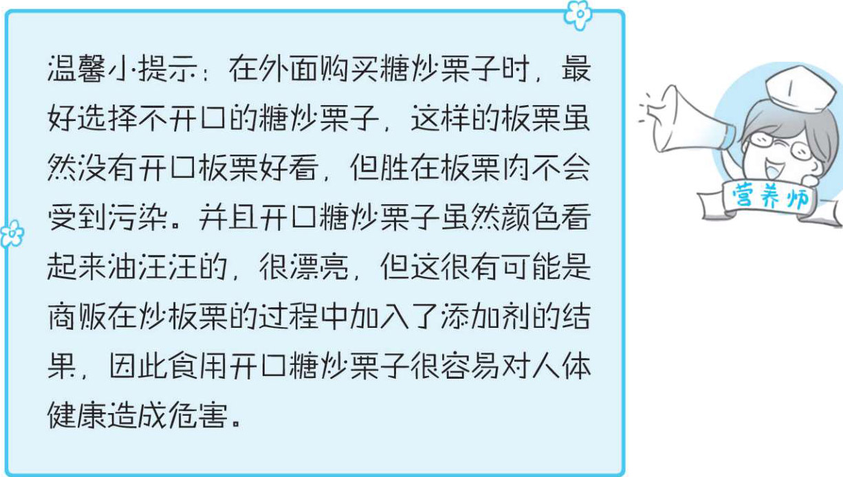板栗特有的清香让人垂涎三尺,欲罢不能。然而食用板栗虽然能够强健心脏、补肾益气,但却不能百无禁忌。因为板栗虽好,吃多了却容易肚胀,导致肠胃不舒服,所以食用板栗一定要有节制。