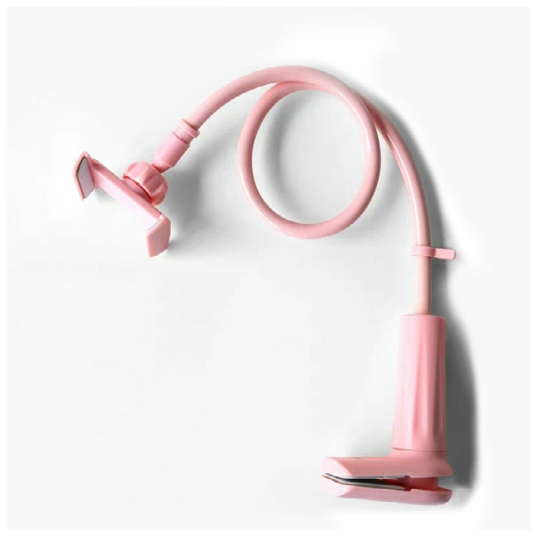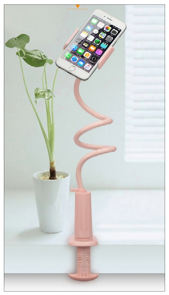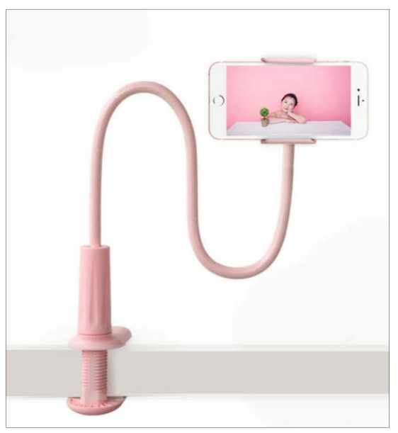 手机支架又称为懒人支架,手机支架可以起到固定、支撑的作用,不用手拿着也可以轻松拍摄视频。首先来了解一下它的结构,在支架的底部有一个夹板,夹板用于固定整个支架,上面的夹子用来固定手机,中间的部分是支架杆,可以弯曲,如图2-12所示。