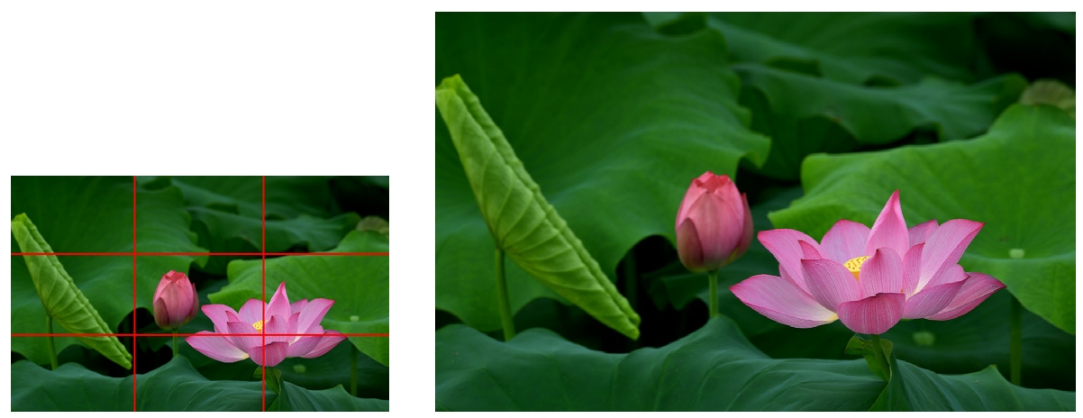 九宫格构图是指用横竖的两条直线将画面等分为九个格子,九宫格的画面中会形成四个交叉点,我们将这些交叉点称为趣味中心点。可以利用这些趣味中心点来安排主体,使主体对象更加醒目。