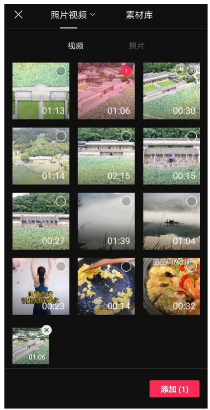 02 打开手机素材库文件夹,选择需要导入、裁剪的视频素材;点击下方的“添加”按钮,如图3-17所示。