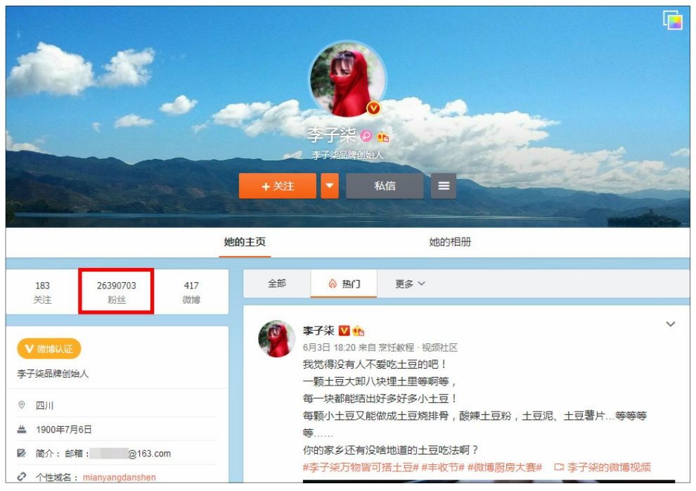 当我们找准自己的定位后,接下来根据定位来定选题、找素材。比如,知名美食博主李子柒,她的定位是美食,细分领域为山野美食,“隐于”山间田园,过着世外桃源的生活。看过她的短视频后,不免让人对田园生活产生向往,这也让她在一众美食博主中脱颖而出,收获了众多粉丝。她的微博粉丝数量高达2639万,如图1-3所示。