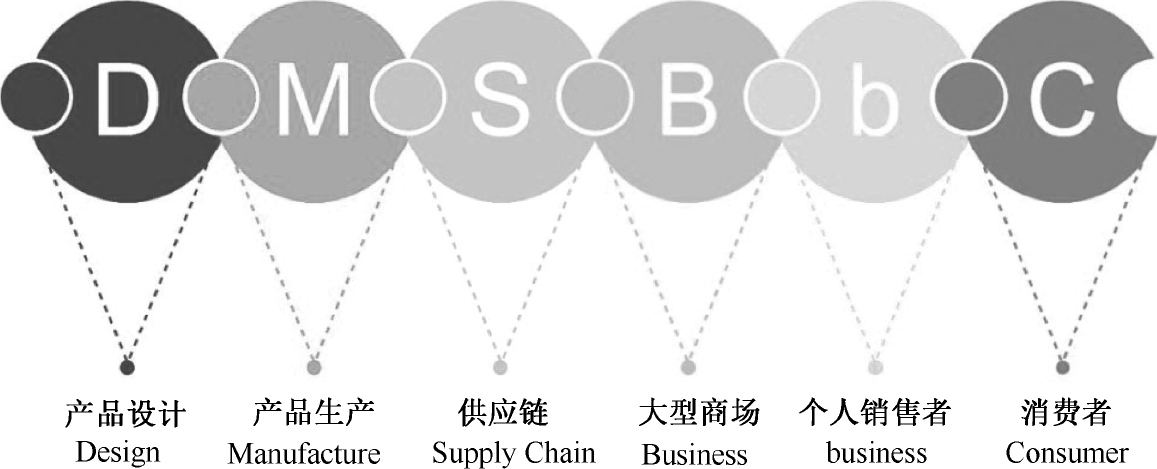 “货”在新零售中是作为客体的一个重要存在。一般来说,零售中的产品从设计到消费可以归纳为D-M-S-B-b-C这样一条路线(见图1-2)。由图1-2可知,在整条消费链中,可以通过重组的方式形成多种商业模式,如当今市场的b2C、B2C、B2B、B2B2C等都是从图1-2的结构中重构而来的商业模式。但是,无论哪种商业模式,从消费者的角度来说,都只能通过零售的“场”,即以B或b为中介来购买产品。